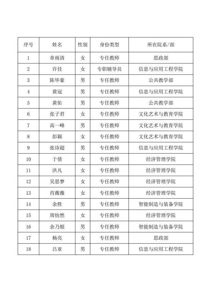 根據(jù)《中華人民共和國(guó)教師法》(以下簡(jiǎn)稱《教師法》)、《教師資格條例》《〈教師資格條例〉實(shí)施辦法》和《教育部教師資格認(rèn)定指導(dǎo)中心關(guān)于做好2024年教師資格制度實(shí)施工作的通知》(教資字〔2024〕1號(hào))及江西省教師資格認(rèn)定指導(dǎo)小組辦公室《關(guān)于做好2024年下半年全省普通高等??茖W(xué)校和成人高等學(xué)校教師資格認(rèn)定工作的通知》(贛教資函[2024]2號(hào))精神要求,結(jié)合學(xué)校實(shí)際,經(jīng)教師資格專家審查委員會(huì)評(píng)審認(rèn)定,包括對(duì)申請(qǐng)認(rèn)定教資的教師進(jìn)行教育教學(xué)基本素質(zhì)和能力測(cè)試、考核及現(xiàn)場(chǎng)確認(rèn)等認(rèn)定環(huán)節(jié),我校2024年下半年申請(qǐng)認(rèn)定高等學(xué)校教師資格符合條件并通過(guò)考核的人員共計(jì)18人,現(xiàn)將認(rèn)定人員名單公示如下: