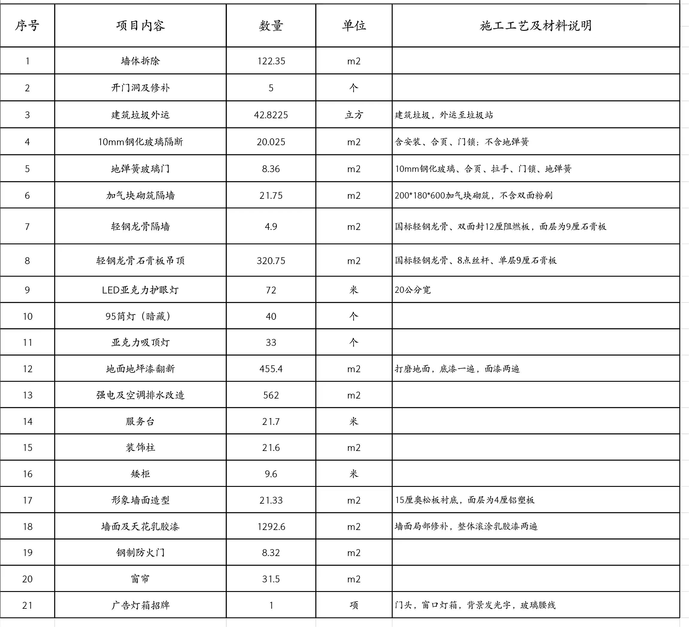 項(xiàng)目內(nèi)容:墻體拆除、開門洞及修補(bǔ)、加氣塊砌筑隔墻、水電規(guī)劃布置、地面地坪翻新、服務(wù)臺(tái)及柜子制造、屋內(nèi)吊頂及隔斷、墻面背景墻及翻新、廣告的設(shè)置等。